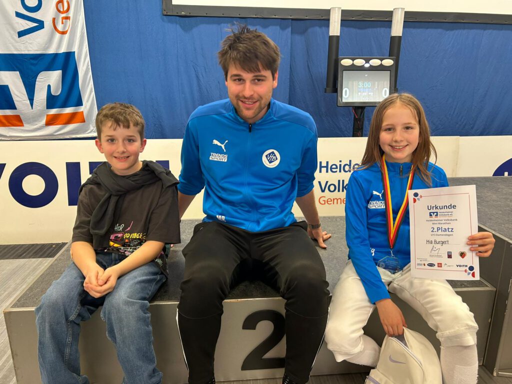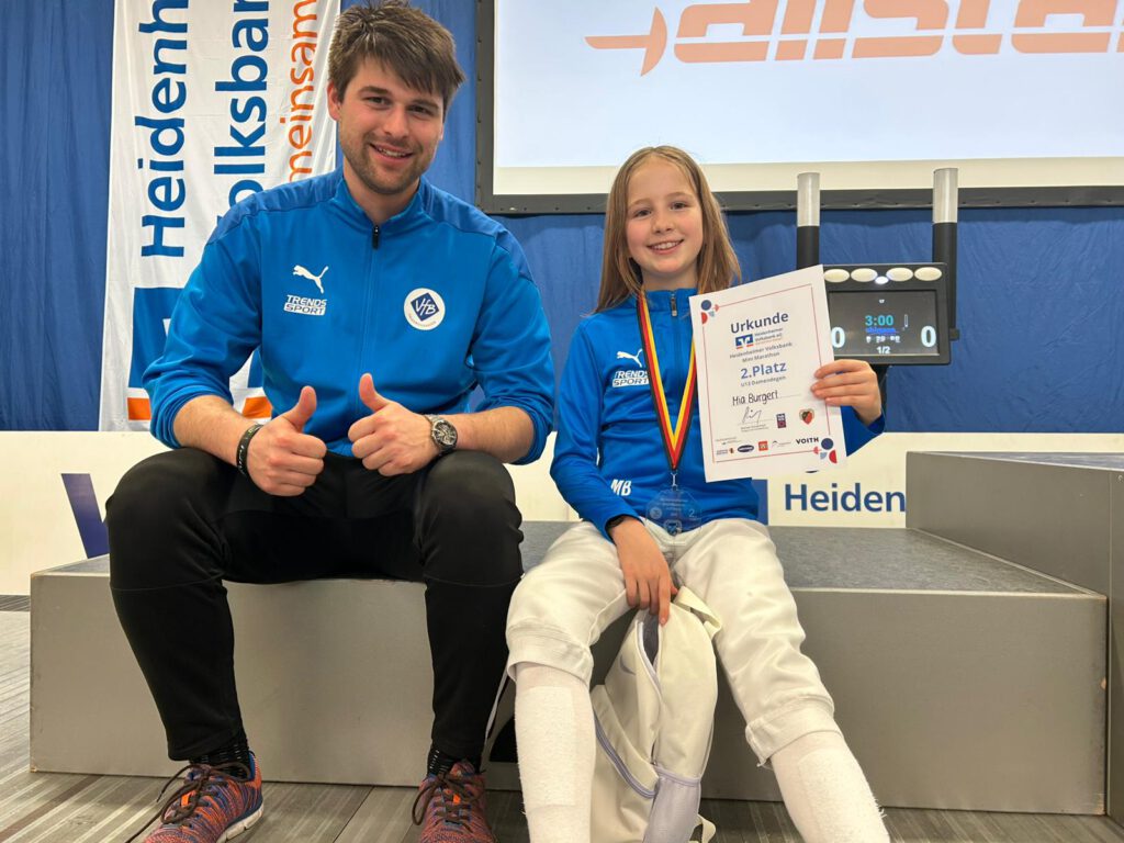 Der Heidenheimer Mini-Fecht-Marathon ist traditionell ein gut besetztes Nachwuchsturnier. Dementsprechend waren in Mia Burgerts Klasse die Besten der Jahrgänge 2013 und 2014 aus ganz Baden-Württemberg und Bayern am Start. In der 7er Setzrunde tat sie sich v.a. gegen die älteren mit nur 2 Siegen sichtlich schwer, was Platz 9 bedeutete. Ein Duell auf Augenhöhe war im 16er KO gegen die an 8 platzierte Gegnerin zu erwarten, doch Burgert ließ dieser beim 10:3 nicht den Hauch einer Chance. Im Viertelfinale wartete die an Nummer 1 gesetzte Waldkircherin, die die VfB Fechterin allerdings beim 10:5 ebenso wenig bremsen konnte. Auch im Halbfinale war für Burgert noch nicht Endstation, denn die deutlich größere und ältere Fechterin aus Heidenheim zog mit 6:10 aus deren Sicht den Kürzeren. Erst im Finale fand Mia Burgert an diesem Tag dann ihre Meisterin und musste sich mit Platz 2 begnügen.